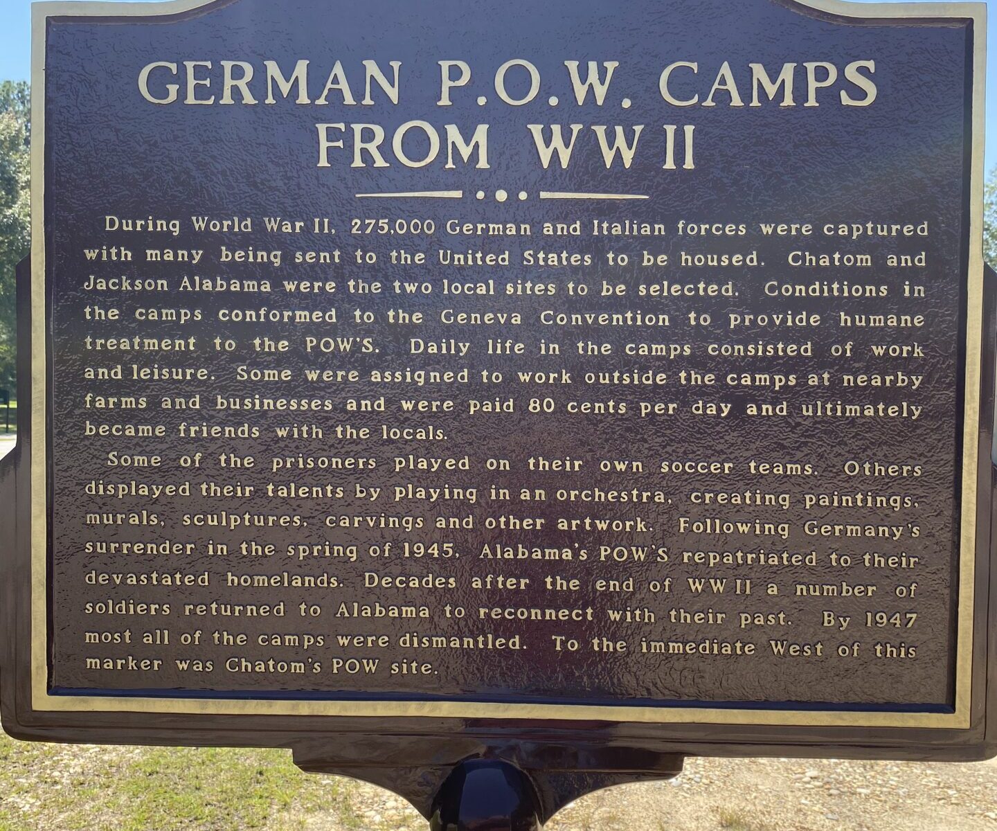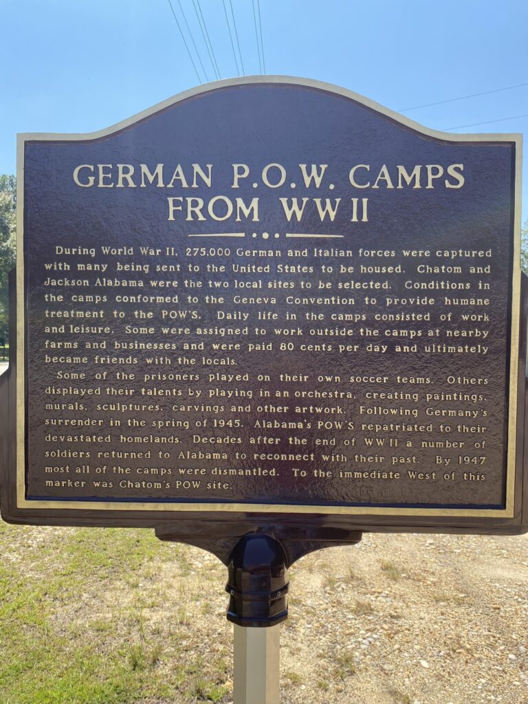 Back in the 1940s, more than 275,000 German and Italian soldiers were captured overseas and shipped across the Atlantic to the United States. Alabama hosted several of these camps, including two right here in Washington County — one in Jackson and another just west of today’s marker in Chatom.