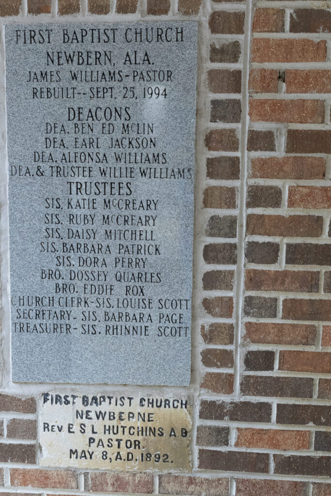 First Baptist Church NewbernEstablished 1892Rebuilt 1994Located at 296 Beech Street, Newbern. 32.59651, -87.53656
