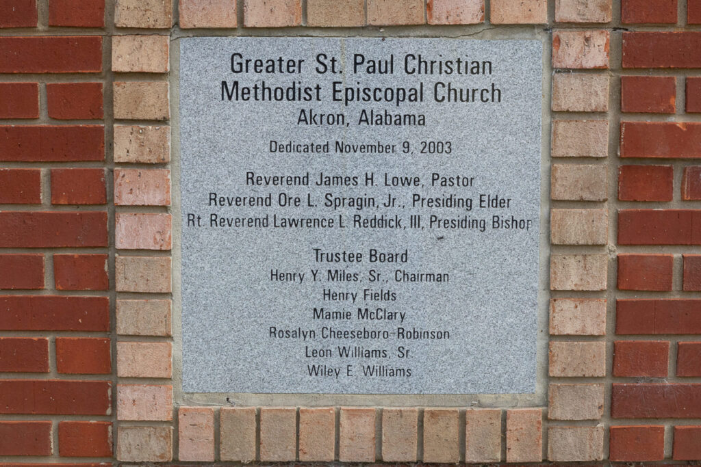 Greater Saint Paul C.M.E ChurchDedicated 2003Located at 3787 Fourth Avenue South, Akron. 32.87521, -87.74194