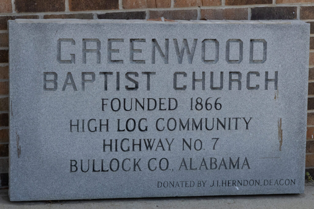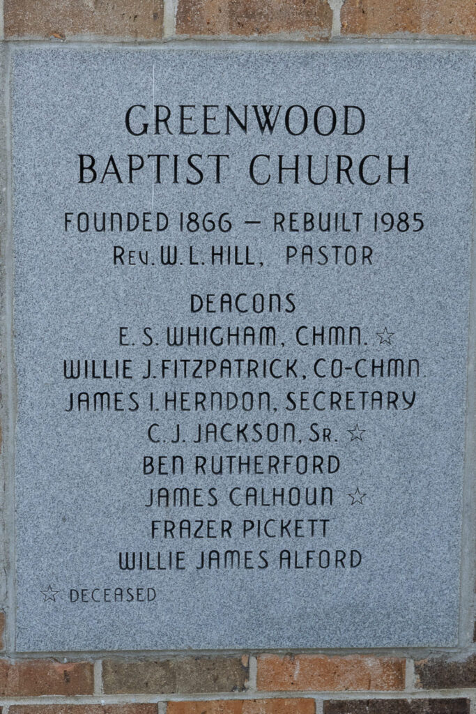Greenwood Missionary Baptist Church Founded 1866Rebuilt 1985Located at 1161 County Road 7, Fitzpatrick. 32.17583, -85.88609