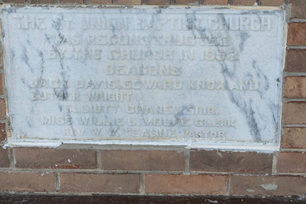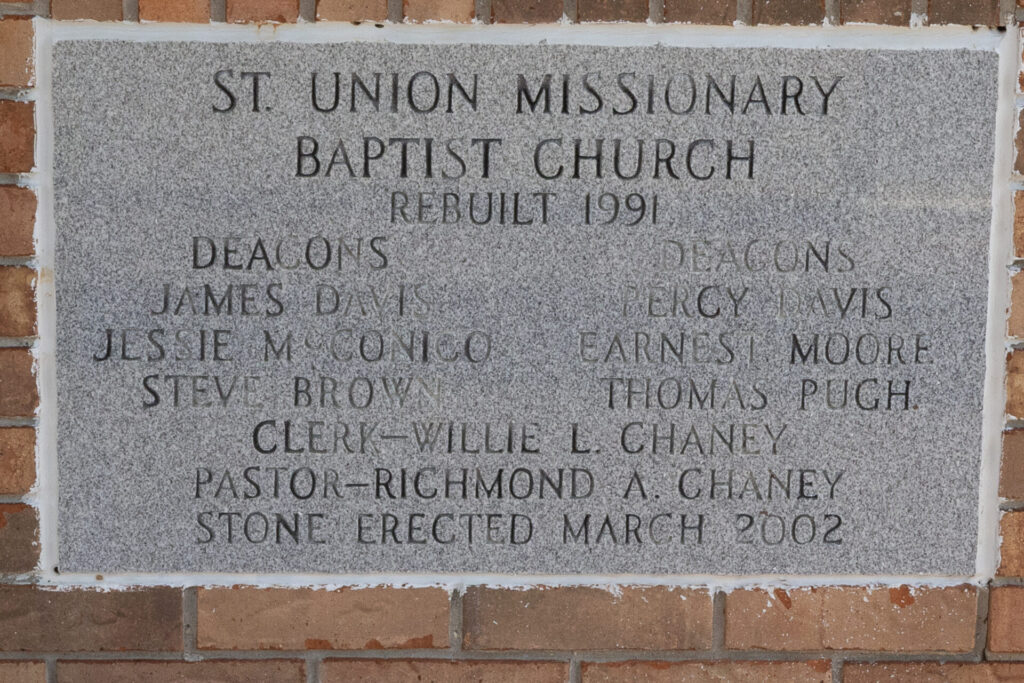 Saint Union Missionary Baptist Church Rebuilt 1953Rebuilt 1991Located at 1524 Pruitt Road, Leroy. 31.51130, -88.00958
